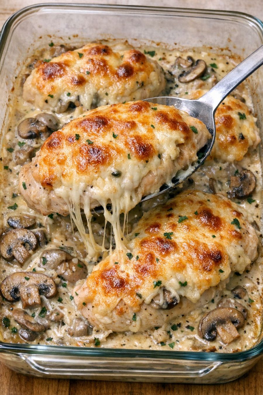 This Swiss chicken bake is rich and saucy, so it’s perfect over buttered egg noodles, mashed potatoes, or simple white rice to soak up all that creamy mushroom sauce. Add a bright green side—like steamed broccoli, a quick green salad with vinaigrette, or roasted green beans—to balance the richness. Warm dinner rolls or a crusty baguette are great for swiping through the pan, and if you want to dress it up a bit for guests, sprinkle a little fresh parsley over the top right before serving.