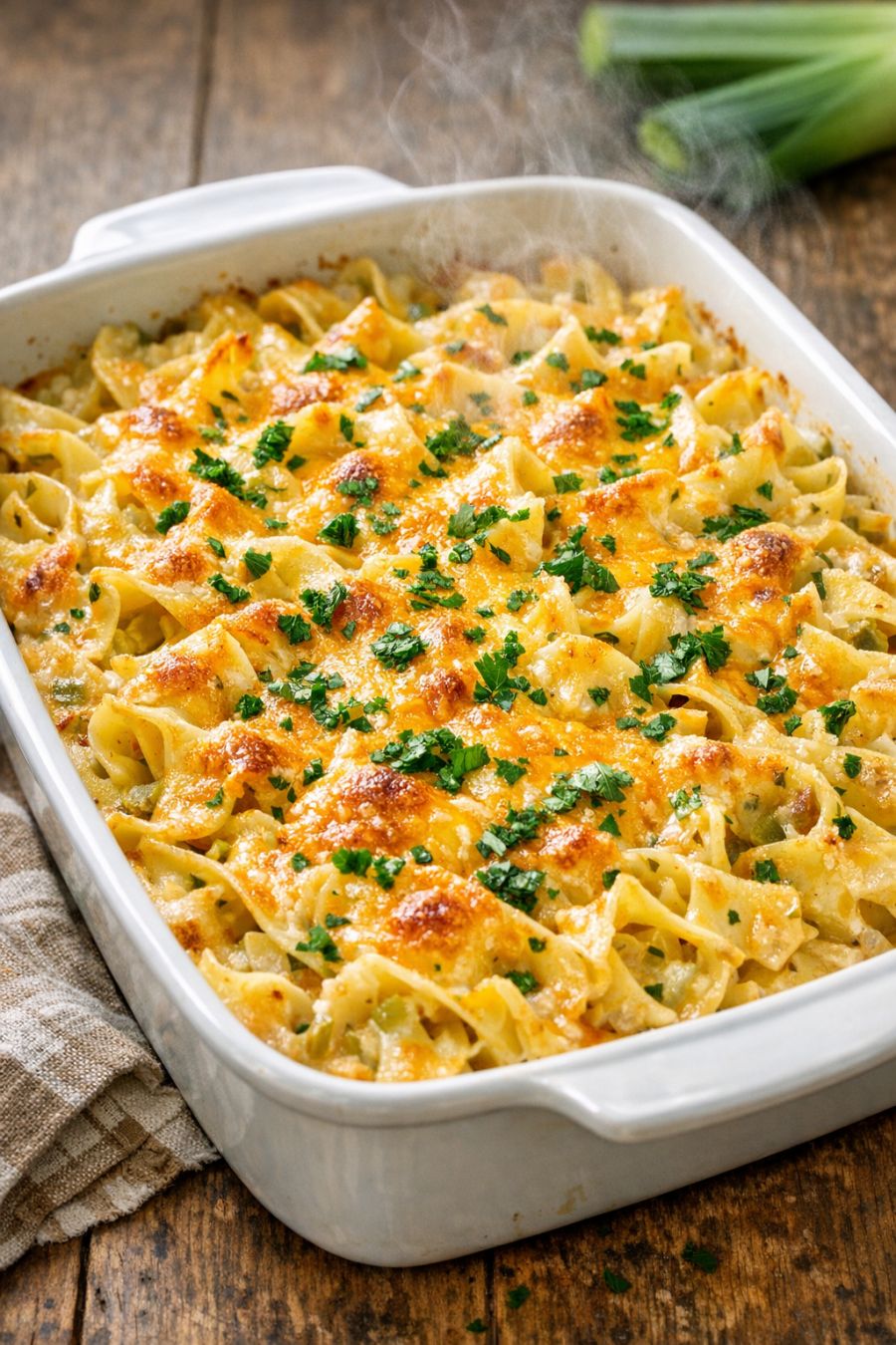 For extra protein, you can stir 1–2 cups of cooked, shredded chicken, diced ham, or cooked ground sausage into the noodles before pouring the soup mixture over the top. If you like a bit more texture, sprinkle 1/2 cup of crushed butter crackers or seasoned breadcrumbs over the cheese in the final baking step for a crunchy topping. To lighten things up slightly, you can use 1 can of cream of leek soup and 1 can of cream of mushroom or cream of chicken instead of both cans being leek, and swap part of the milk for low-sodium chicken broth (use 1 cup milk and 3/4 cup broth). For a richer, more indulgent casserole, replace 1/2 cup of the milk with heavy cream or half-and-half. If you need to prep ahead, assemble the casserole up through adding the first half of the cheese, cover tightly, and refrigerate up to 24 hours; when baking from cold, add 5–10 minutes to the covered bake time and check that the noodles are tender. Always make sure the casserole is heated to a safe temperature (at least 165°F/74°C in the center) before serving, especially if you add cooked meats. Leftovers should be cooled, covered, and stored in the refrigerator within 2 hours and eaten within 3–4 days; reheat thoroughly until steaming hot. Because this recipe uses canned soup and dairy, avoid leaving the baked casserole out at room temperature for more than 2 hours to reduce the risk of foodborne illness.