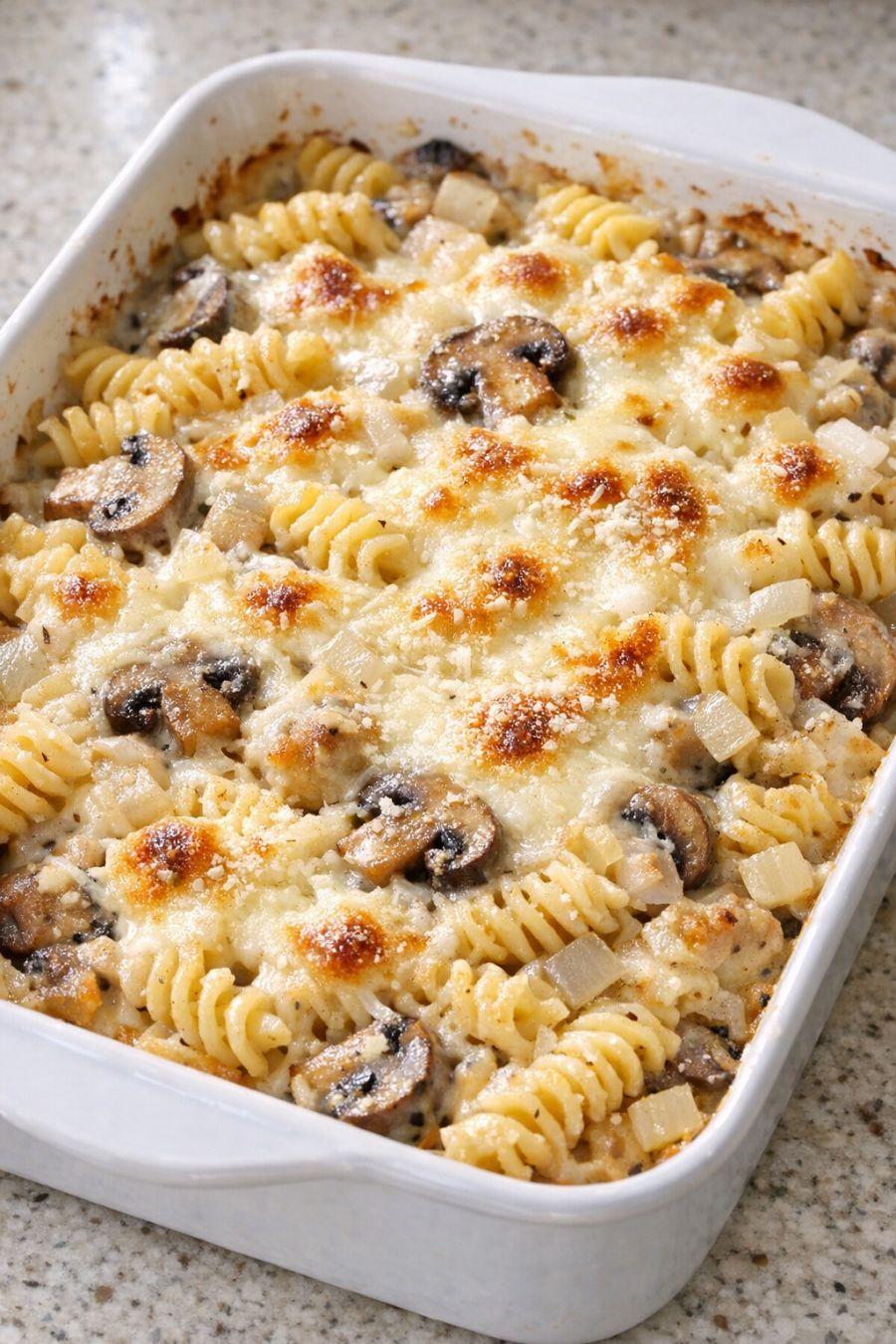 Serve this creamy mushroom rotini hot from the oven with a simple green salad or some steamed broccoli to balance the richness. Garlic bread or warm dinner rolls are great for soaking up the extra sauce. If you’d like a little extra protein on the table, grilled or rotisserie chicken, baked sausage, or a simple pan-seared pork chop pairs nicely with the earthy mushroom flavor. A sprinkle of extra Parmesan at the table lets everyone adjust the cheesiness to their own taste.