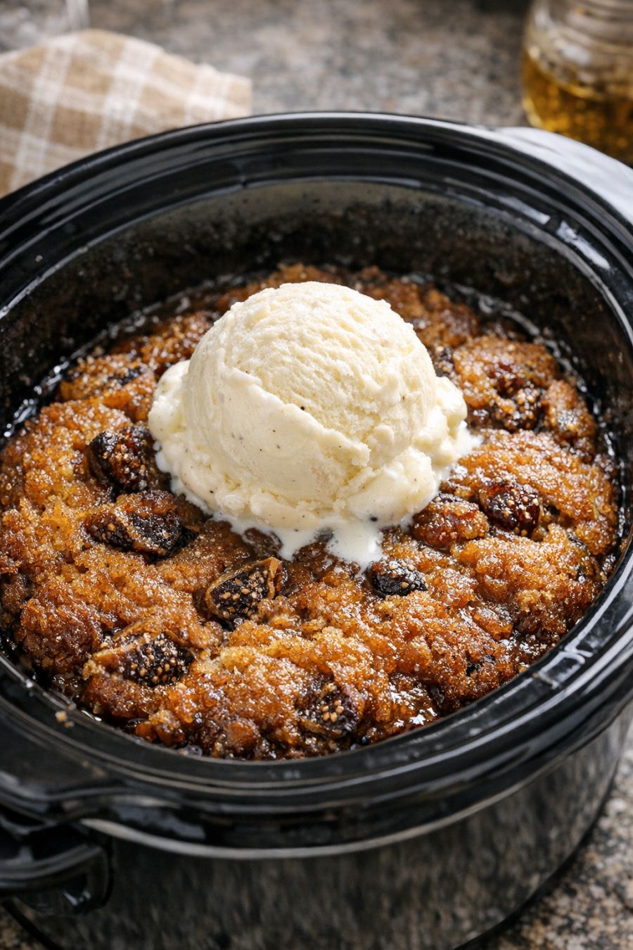 Serve the warm fig compote cake straight from the slow cooker, spooned into small bowls so you catch both the saucy figs from the bottom and the soft cake from the top. It’s especially good with a scoop of vanilla ice cream, a dollop of whipped cream, or a spoonful of plain Greek yogurt if you like a little tang. A drizzle of heavy cream or half-and-half over each serving gives it that cozy, vintage dessert vibe. Pair it with hot coffee, black tea, or a small glass of dessert wine for after-dinner. Leftovers are great the next morning with yogurt, almost like a dressed-up fruit and granola situation.