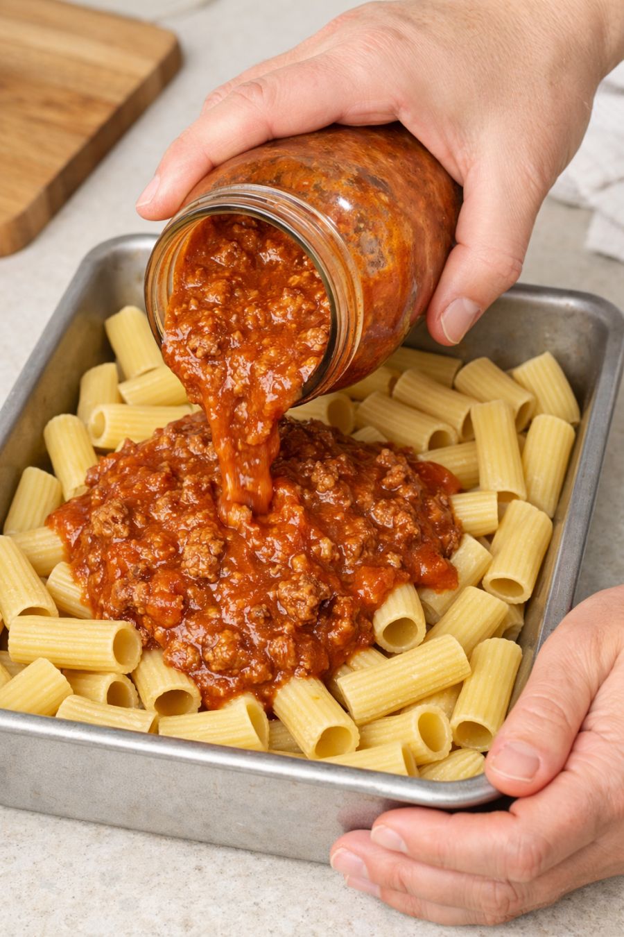 Scatter shredded raw zucchini over raw cavatappi pasta, together with 3 simple ingredients, into a cast iron baking pan for a comforting feast that disappears faster than anything else