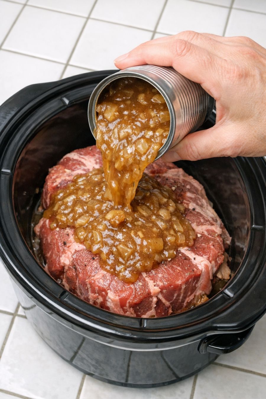 Dump condensed french onion soup over raw beef chuck, together with 2 ingredients, into slow cooker for a comforting meal that disappears faster than anything else