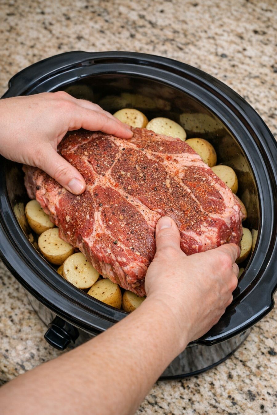 Place chuck roast onto raw halved potatoes, alongside 3 extra ingredients, into slow cooker for a hearty Sunday dinner that's the one everyone asks for