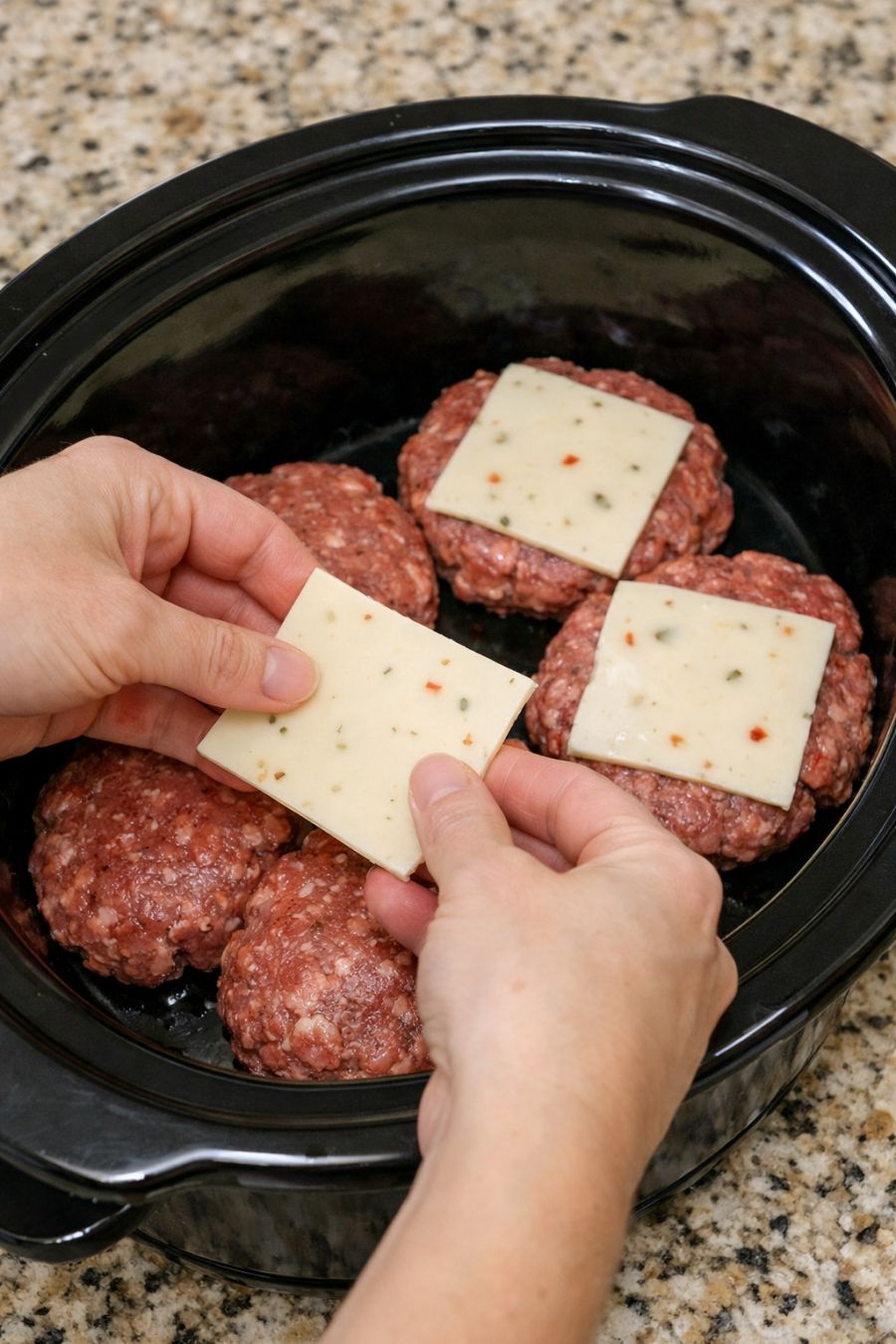 Place pepper jack cheese slices over beef patties, plus 3 ingredients, into slow cooker for a spicy dinner that's my default when I don't know what to make