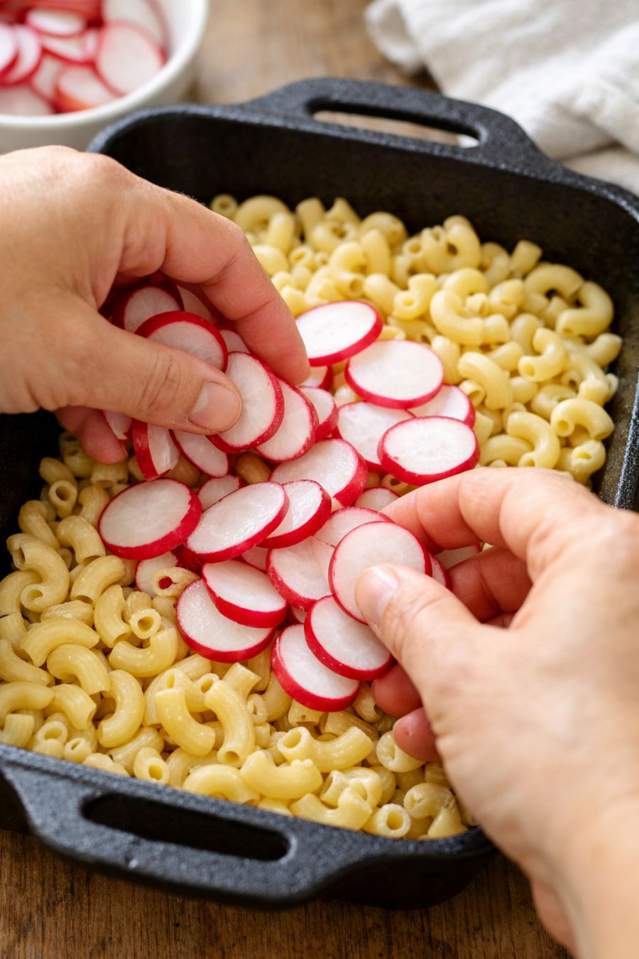 Pile sliced raw spring radishes over dry elbow macaroni, paired with 2 extra additions, into a cast iron baking pan for a seasonal bake that's always a yes in my house