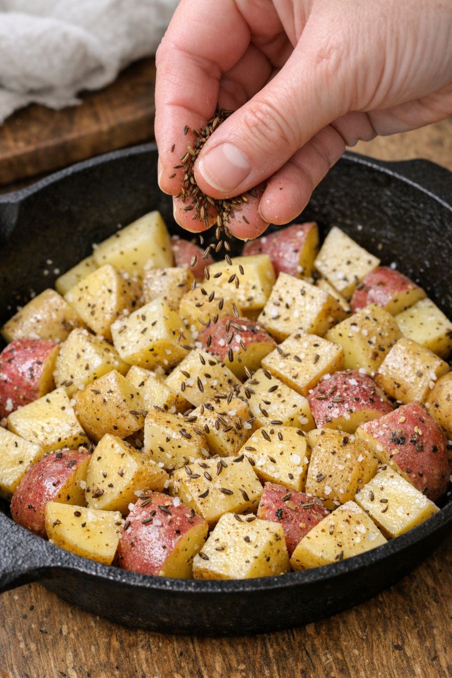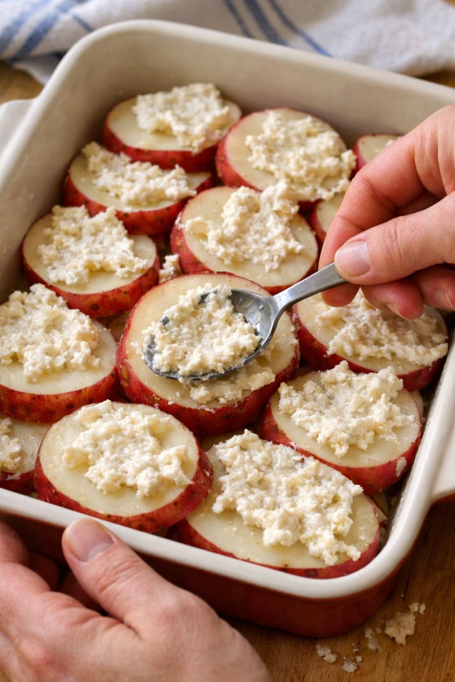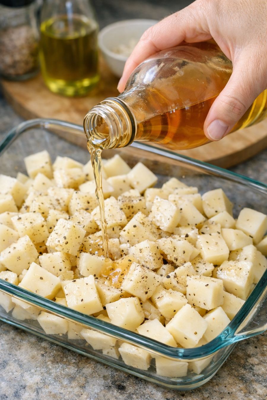 Drizzle apple cider vinegar over raw diced white potatoes, alongside 2 additional ingredients, into a glass baking dish for a hearty spring supper that's my default when I don't know what to make
