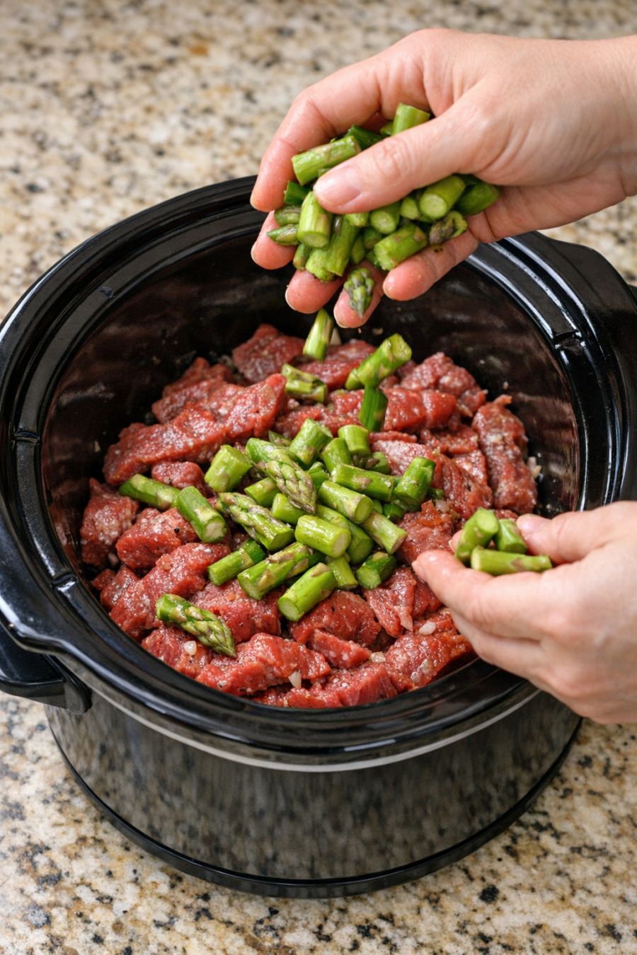 Layer sliced fresh leeks over raw beef chuck roast, together with 2 ingredients, into slow cooker for a comforting family meal that disappears faster than anything else