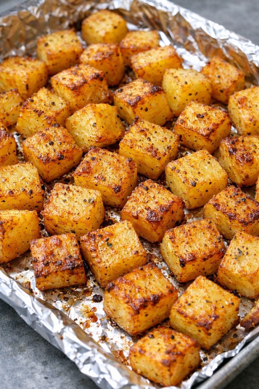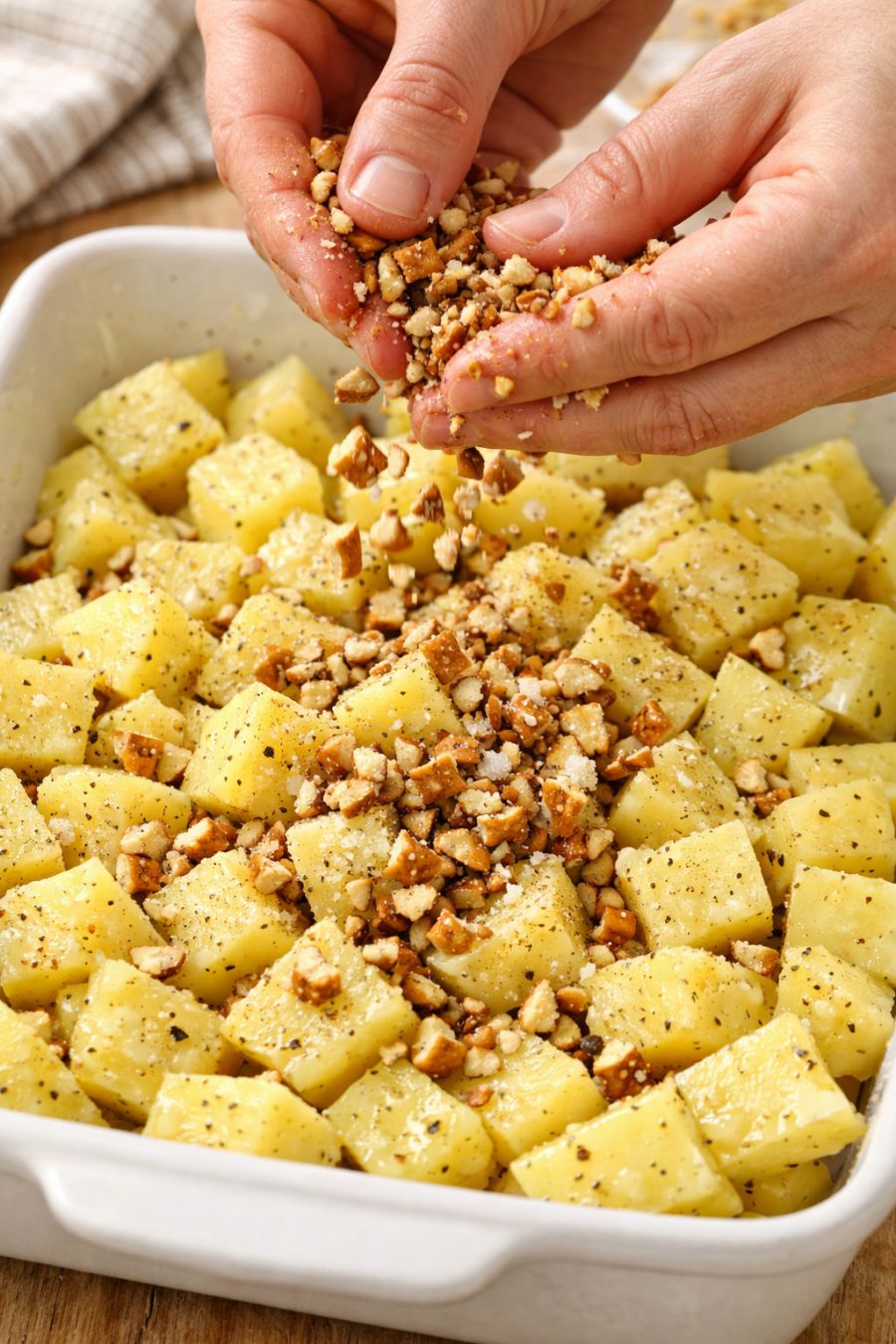 Scatter crushed salted pretzels over raw cubed yukon gold potatoes, together with 2 other ingredients, into a ceramic baking pan for a comforting dinner that disappears faster than anything else