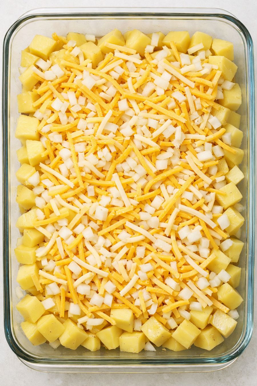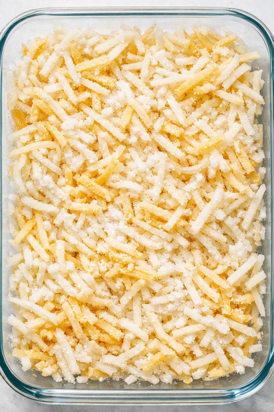 Dump frozen hash browns in the casserole dish with 3 other ingredients and watch your family fight over the last scoop