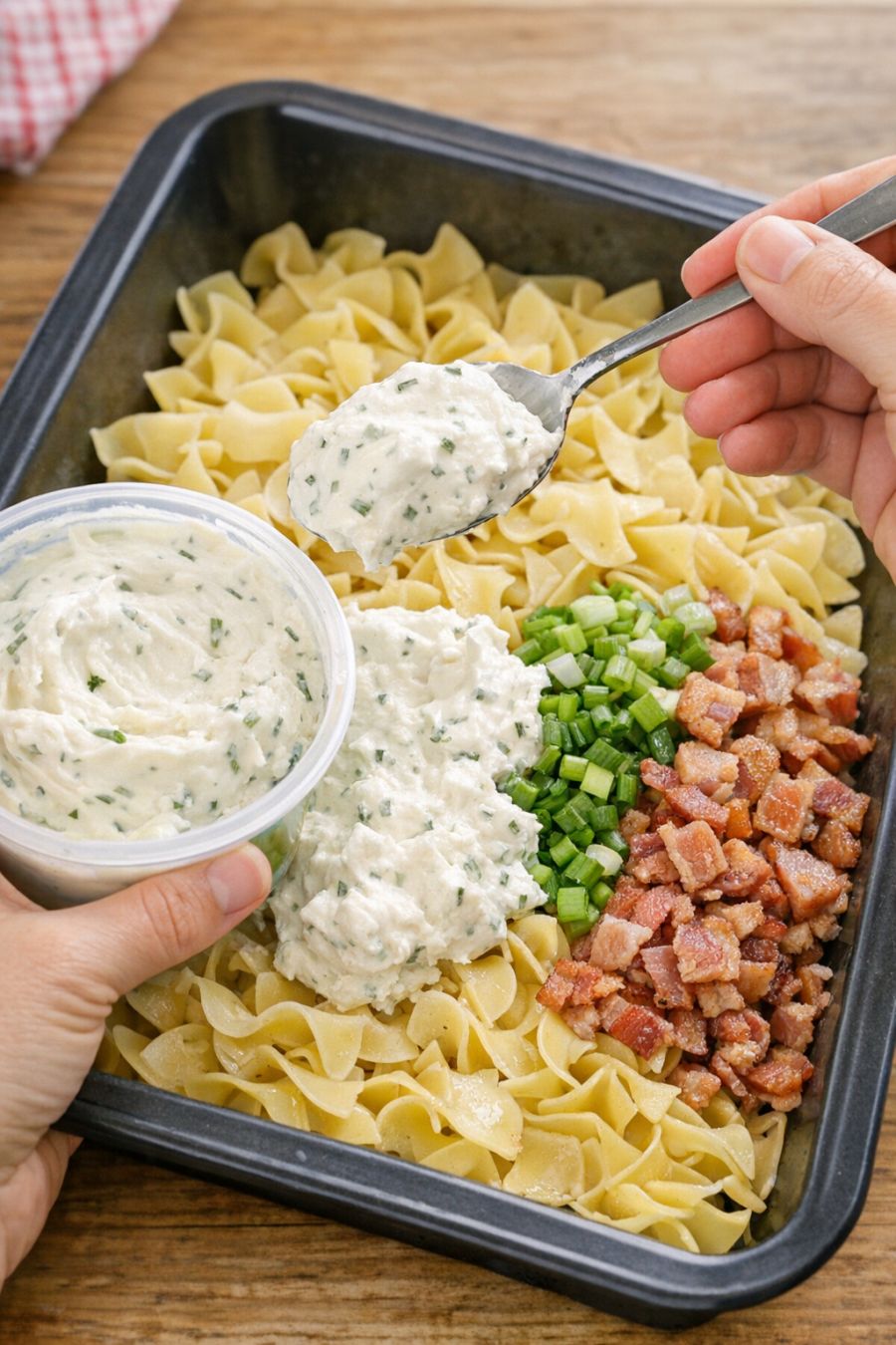 Spoon tub sour cream and chive dip and these 2 ingredients over uncooked egg noodles into a baking pan for a cozy dish your family will want every single week