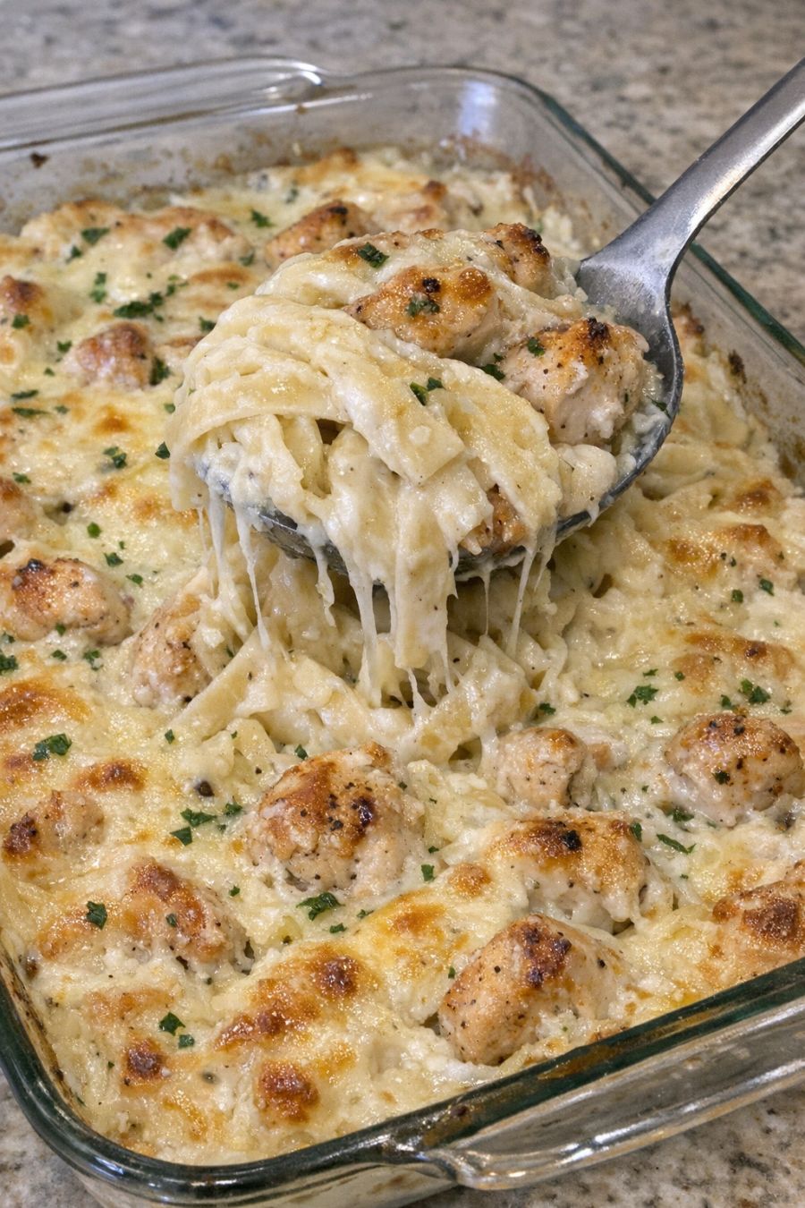 Spoon tub sour cream and chive dip and these 2 ingredients over uncooked egg noodles into a baking pan for a cozy dish your family will want every single week