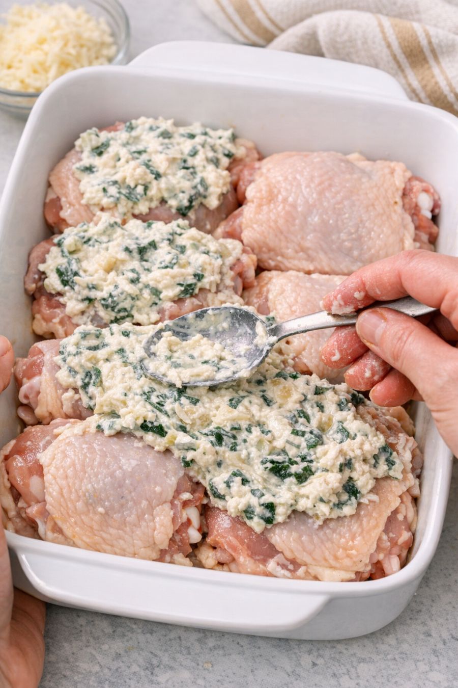 Spread creamy spinach artichoke dip over raw bone-in chicken thighs, paired with 4 ingredients, into a ceramic baking dish for an effortless feast that's always a yes in my house