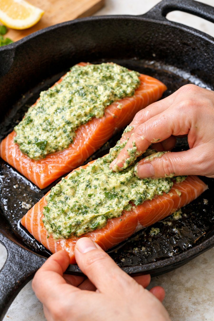 Slather this 1 herby mixture over raw salmon fillets into a cast iron skillet for a low carb seafood dinner that tastes like you put in way more effort